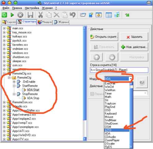 выбираем скрипт RemoteCFG.scs и правим StartRemote и StopRemote, меняем модуль